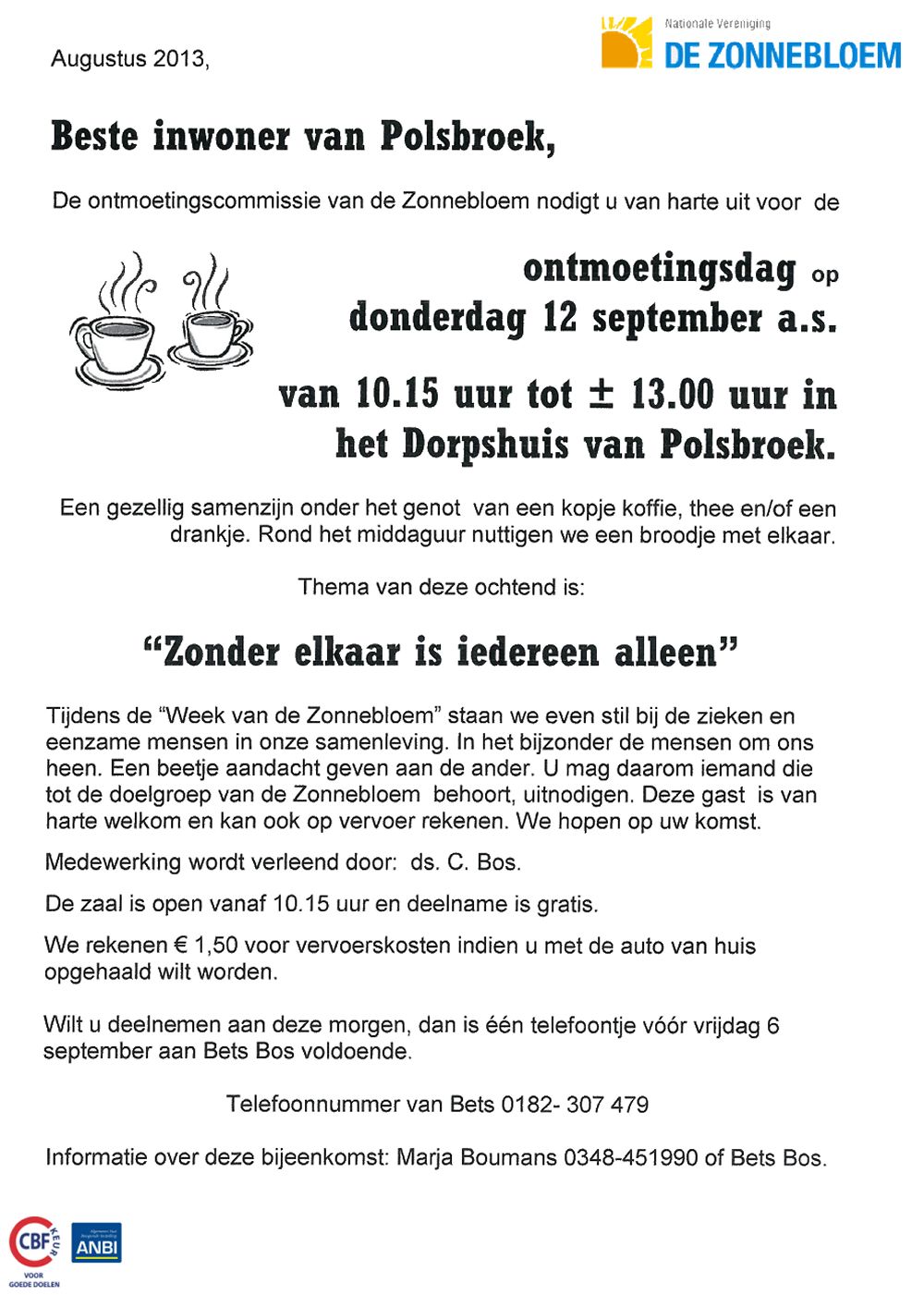 aan ondervoede kinderen van Burkino Faso (Afrika)". Er kan gestart worden vanaf 10.00 uur in Polsbroek, bij de fam. A. van Dam (Dorp 80), in Benschop (Herv. Kerk/Dorp), in Lopik (Herv. Kerk/Schaapskooi) en in Waarder (Fam. Cromwijk, Westeinde 39A) Om 16.00 uur sluiten de start- stopplaatsen weer. De afstanden variëren van 15 tot 55km. Inschrijfgeld: Gezin € 5,00 Volwassen p.p € 2,50 Kind tot 12 jaar € 1,00. Bij genoemde start- stopplaatsen zijn consumpties verkrijgbaar. Voor verdere info kunt u bellen met de fam. van Dam, tel.: 0182-309402. |