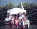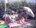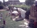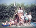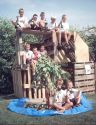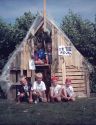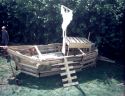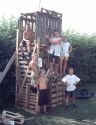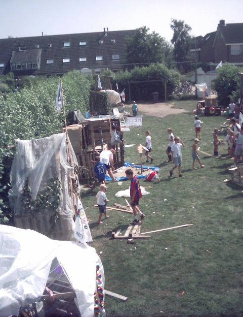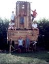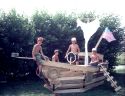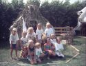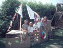 Dinsdag 12 augustus. Wederom tropische omstandigheden. Vandaag worden de puntjes op de i gezet. De stapels hout van gisteren hebben een andere bestemming gekregen. Een rovershut, pony, flessen, barbeque of palm eiland, uitkijktoren, vuurtoren of boot worden vandaag verder afgemaakt. De gemaakte vlaggen worden in top gehezen en er wordt geposeerd voor de fotograaf met stropdas, wat met de zon in de ogen soms wel vervelend was...
