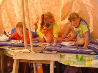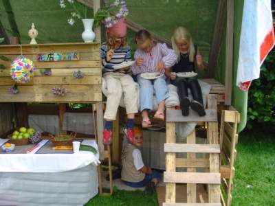 De tent is open voor de middagvoorstelling van 1-2-8 theater.