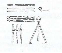 Jullie krijgen palen en een touw om deze palen boven aan elkaar te binden. Daarna kun je de wigwam met zelf meegebrachte doeken bekleden of dicht timmeren met hout.