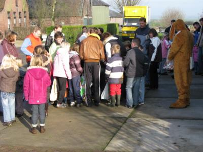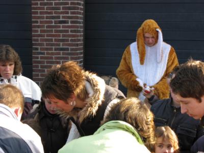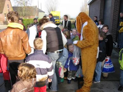 al geen paashaas. Gelukkig kon iemand ons vertellen dat de paashaas de eieren nu ergens anders had verstopt. Een lekkere wandeling naar het eind van het dorp bracht ons bij een veldje vol met eieren. ZOEKEN MAAR! Iedereen kreeg na afloop een kinderei, de persoon of groep met de meeste eieren kreeg een prijs. |