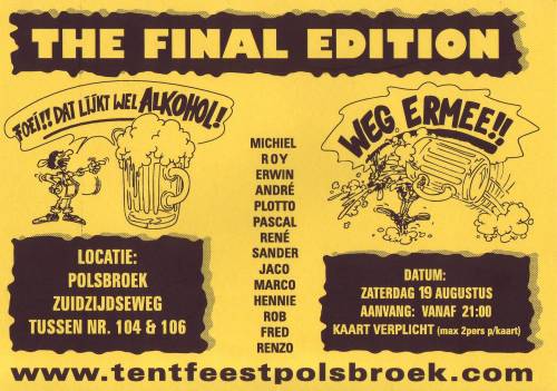 remebers the 90's. (Zie ook www.tentfeestpolsbroek.com) Wil je een "goede" foto in je mail? Klik met je rechtermuis knop op de betreffende foto, kies afbeelding opslaan. Je ziet dan een nummer. Mail dat nummer naar de webmaster en je krijgt het origineel terug in je mail. |